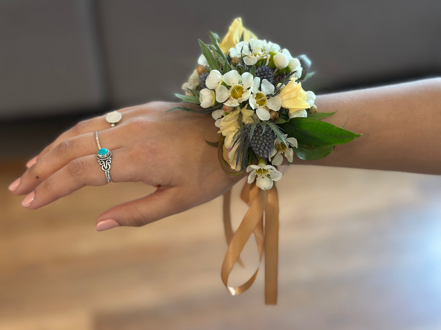 We create custom wrist corsages with a variety of band options, including diamante, pearl, jewellery cuff, or ribbon, and a wide selection of flower combinations and accent details. We can also create a matching buttonhole for a coordinated look, perfect for school formals, graduations, or special events.