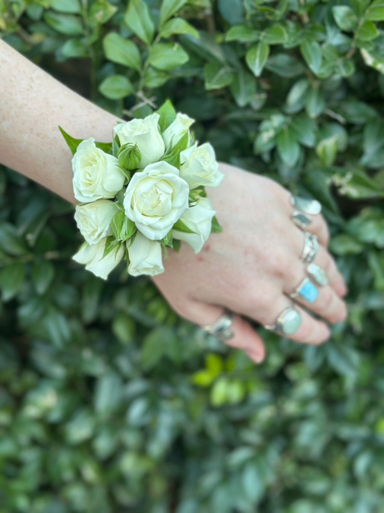 The Snow range is a white collection of corsages and buttonholes, featuring delicate spray roses with unique foliage. Handcrafted for elegance, sold individually or as a set for your high school formal