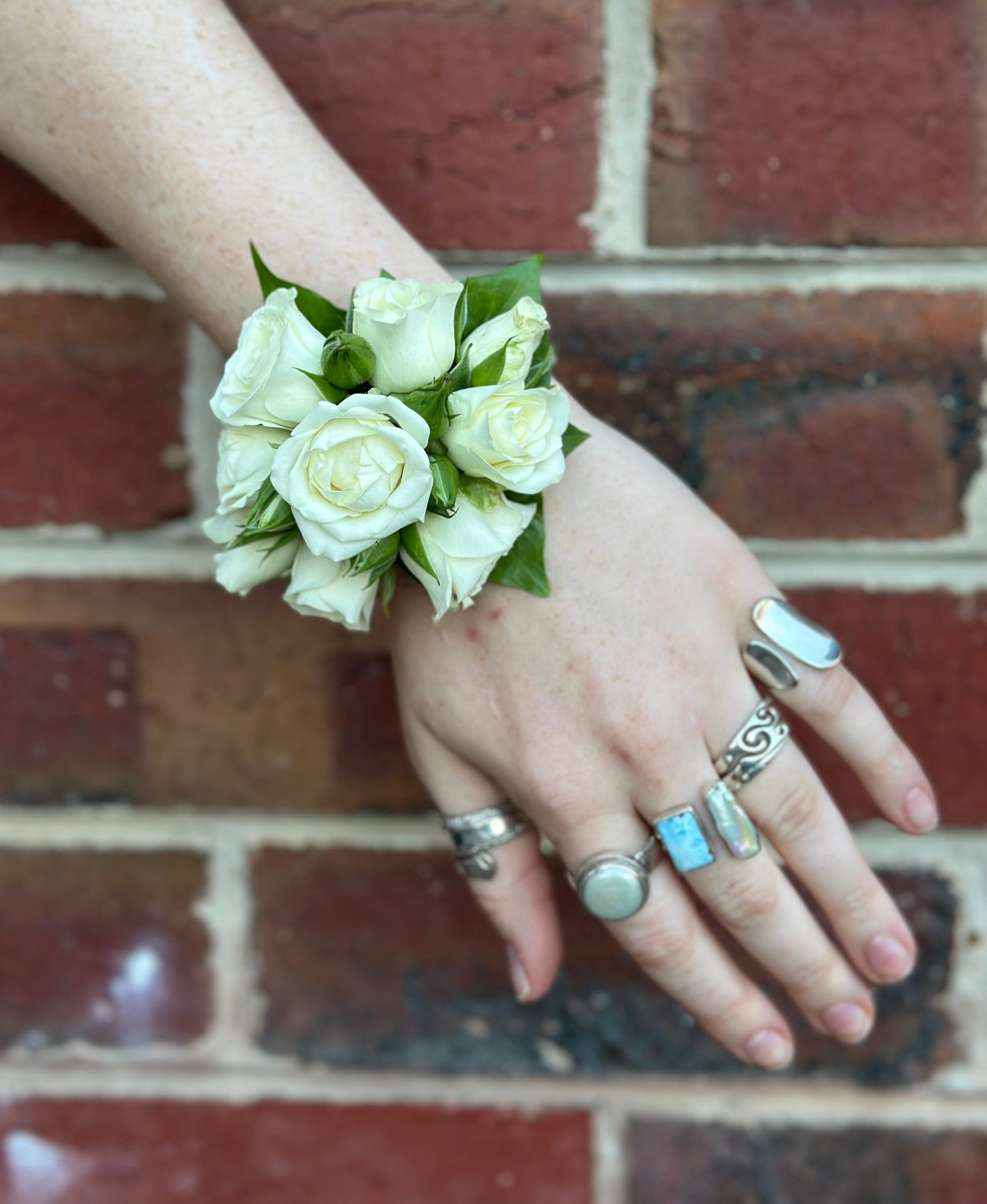 The Ivory Leaf wrist corsage showcases elegant white spray roses paired with fresh greenery, all secured on a refined pearl wristlet. Designed specifically for high school formals, this delicate accessory combines timeless floral beauty with subtle sophistication, offering both comfort and style for a memorable evening. Its classic design complements formal attire effortlessly, making it a perfect choice for special occasions.
