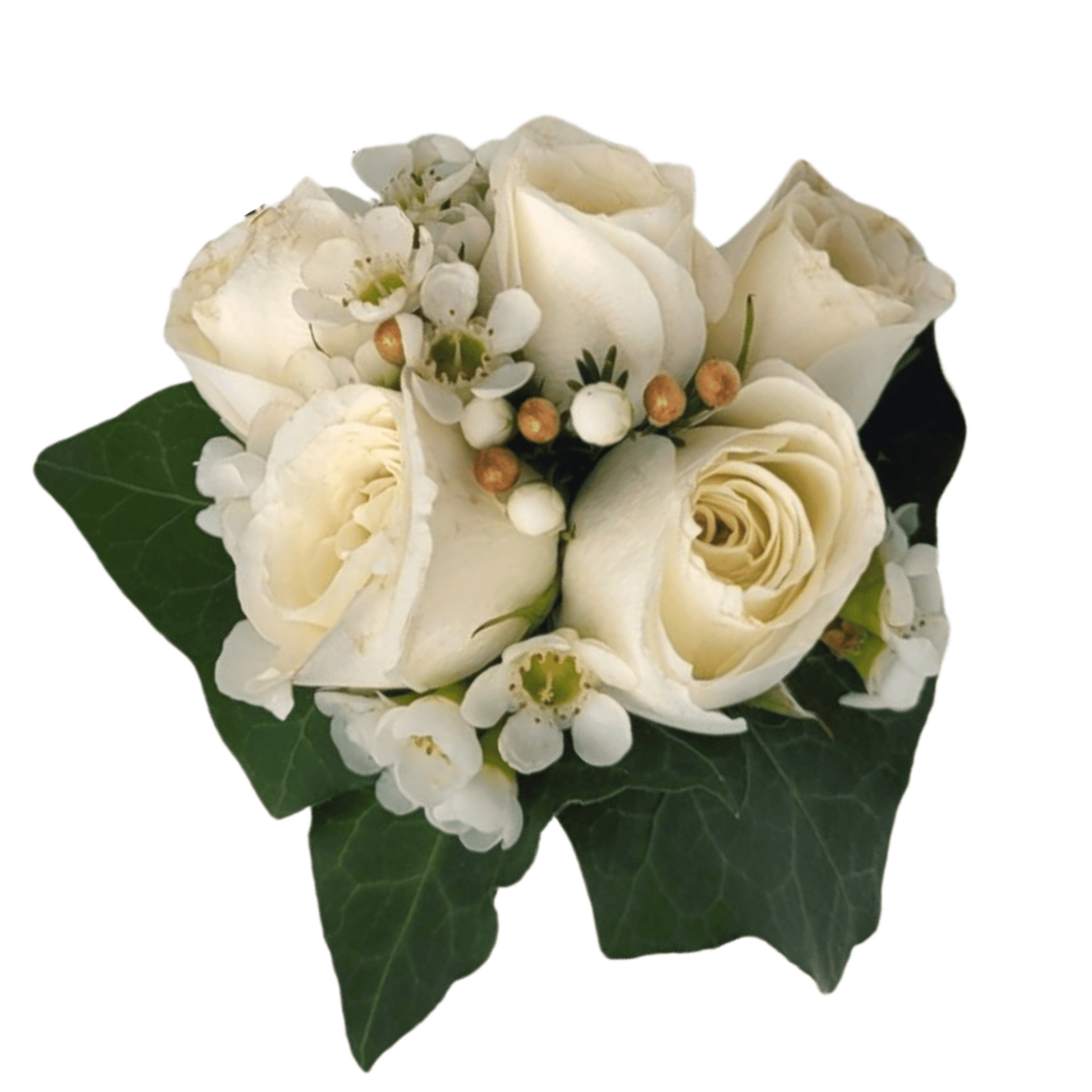 This elegant corsage features delicate white spray roses paired with subtle wax flowers, expertly arranged on a refined pearl wristlett. Designed specifically for high school formals, it offers a timeless and sophisticated accessory that complements any formal attire with grace and charm.